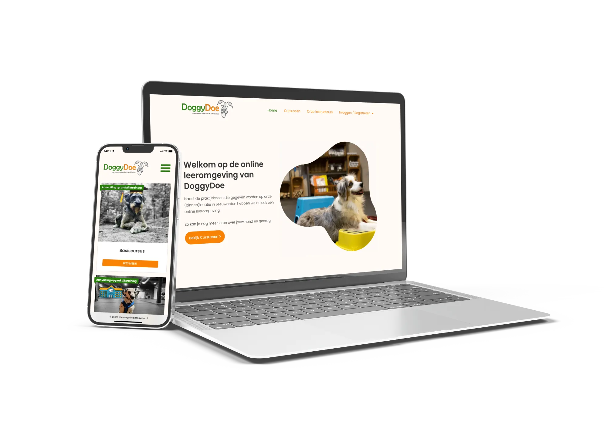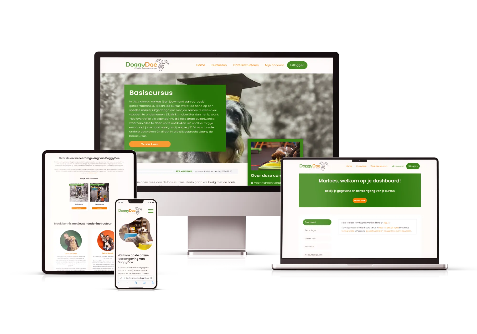 Selma van DoggyDoe wilde heel graag haar praktijktrainingen uitbreiden met een online gedeelte. Om te stimuleren dat hondenbaasjes thuis ook aan de slag gaan met de oefeningen die ze leren in de praktijktrainingen. DoggyDoe had al een afgeschermd gedeelte op de website waar cursisten toegang toe hadden maar de leerbeleving was niet prettig. De opdracht van DoggyDoe was dan ook het maken van een online leeromgeving ter aanvulling op twee van hun praktijktrainingen.
